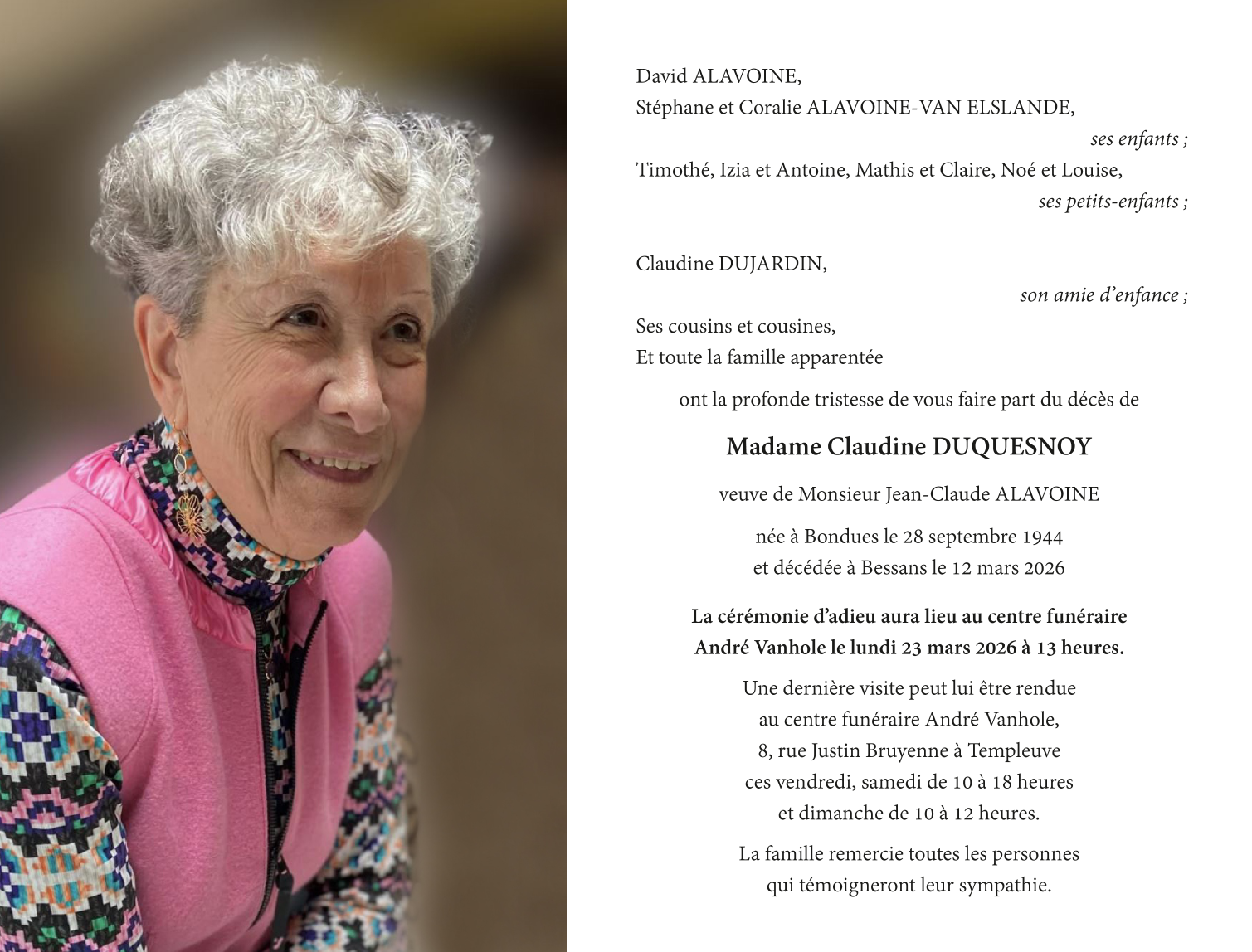 Veuve de Monsieur Jean-Claude ALAVOINE
